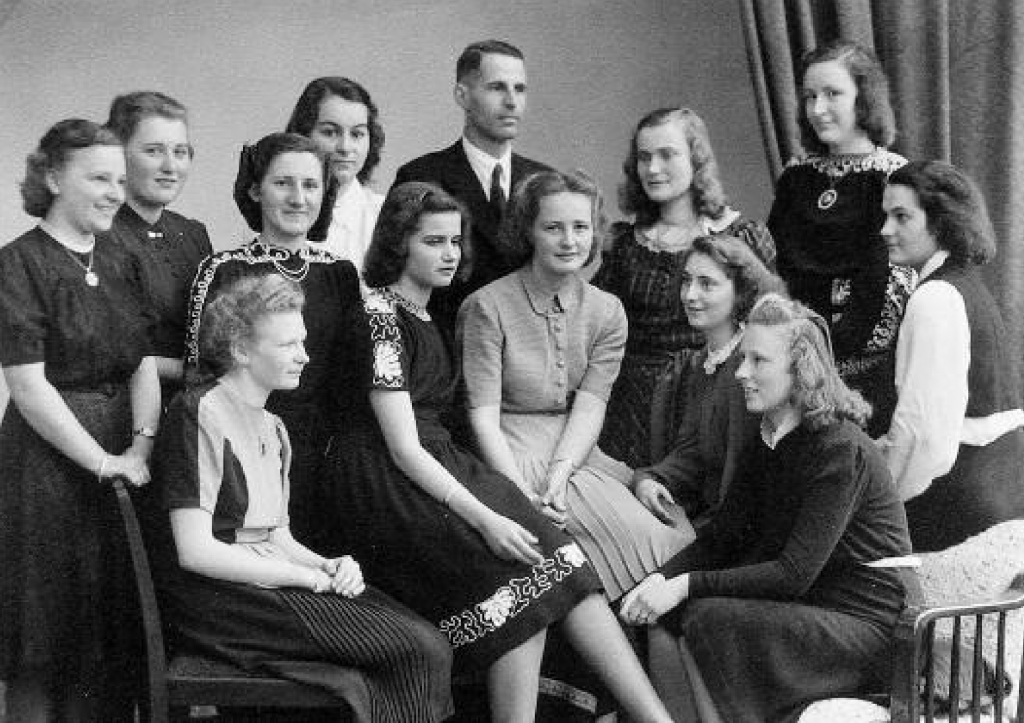 Erster Abiturjahrgang 1943, im Hintergrund Schulleiter Walter Dorfmüller (Archiv VHG).